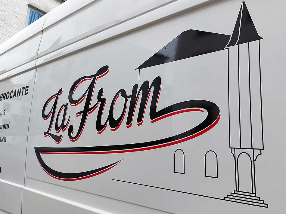 La FromRéalisation de 2 enseignes en potence sur d'anciennes plaques récupérées dans une brocante, évidemment!Réalisation d'un chevalet disposé un bordure de la route cantonale.